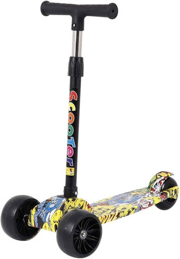 Bring bold style to playtime with the ALBER-615 kids scooter featuring a striking yellow graffiti comic print. Designed for young riders, this 3-wheel scooter ensures smooth gliding and superior balance with its wide wheels and adjustable handlebar.