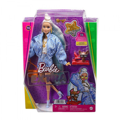 Turn up the style with the Barbie Extra Doll – Blonde with Bandana. This doll rocks a bold fashion look with extra-long blonde hair, a printed bandana, and an outfit layered with vibrant textures and accessories. With a confident attitude and a pet companion included, Barbie Extra dolls are all about self-expression and standing out with flair.