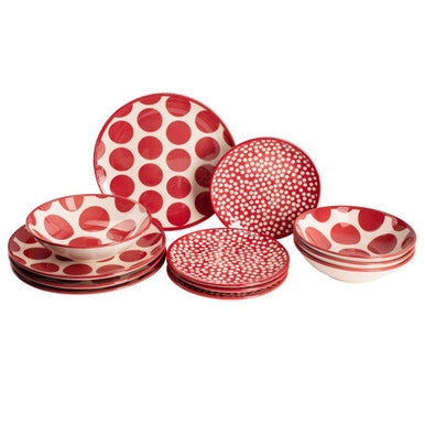 طقم أدوات مائدة من بينيتون هوم مكون من 12 قطعة (4 أطباق عشاء 27 سم، 4 أطباق عميقة 21 سم، 4 أطباق حلوى 19 سم) من الفخار الأحمر المنقط | BE-2063