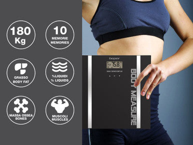 Electronic bathroom scale with 6mm thick tempered glass platform. Thanks to the metal inserts, entering your data, it calculates the muscoles and bone mass, the percentage of liquids with capacity up to 10 memories. Maximum load 180 Kg. LCD display. Automatic switch-off and reset with indication of overload and battery level. Battery included.