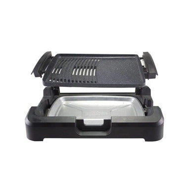 Electric barbecue with support body in resistant plastic and die-cast aluminum plate with a non-stick coating of 39x29cm with heat-insulated handles.