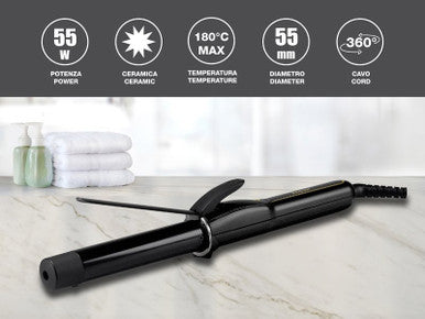 Hair curling iron with a modern design, perfect to create well defined waves and curls in no time: in just over 1 minute it will reach the max temperature of 180°C, thanks to its PTC heating elements, while the ceramic coating will keep the hair well protected and shiny. 25 mm diameter for perfec waves and fsoft curls. 360°C swivel cable and cold tip provide maximum comfort during use. LED working light and ON/OFF switch for maximum safety.