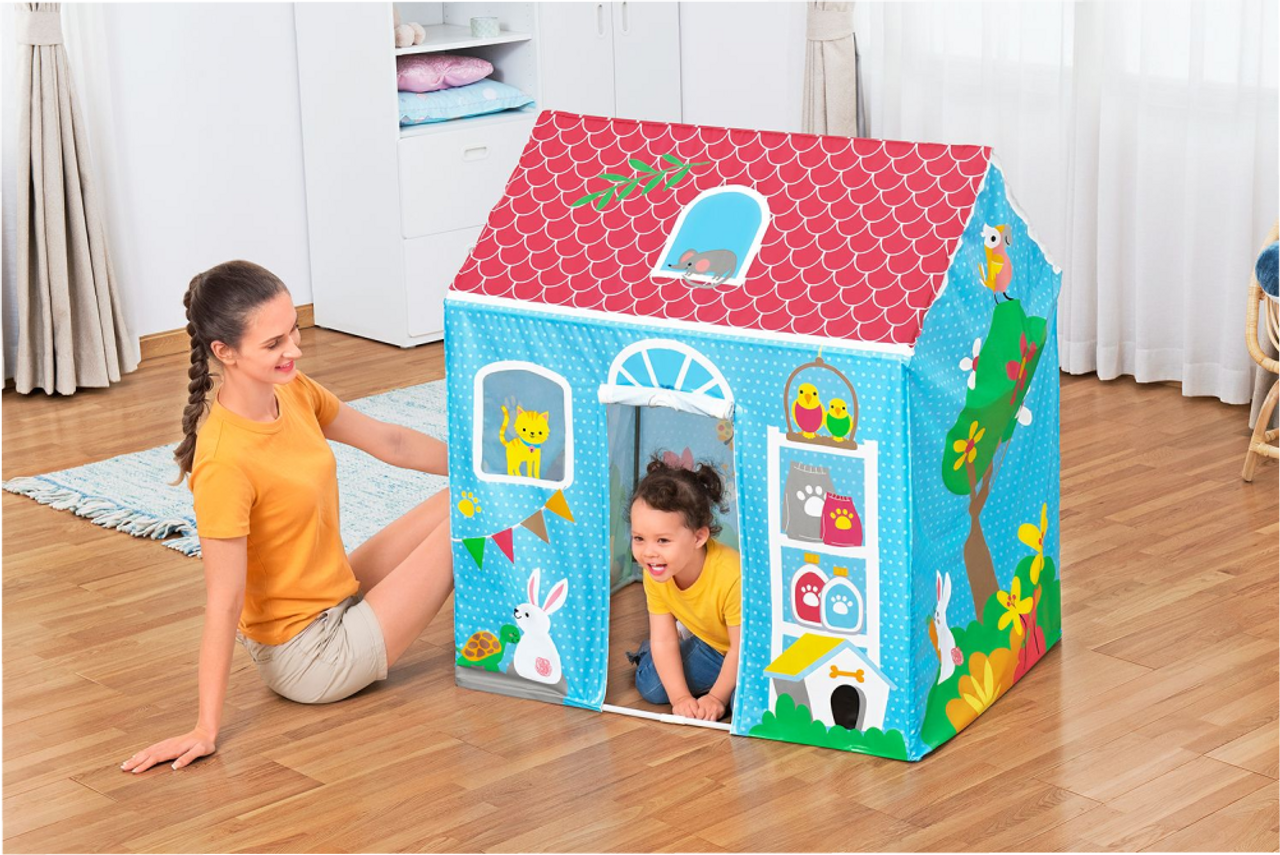 Let kids explore imaginative fun with the Bestway P-52007 Inflatable Playhouse, designed in a cute animal-themed house shape.