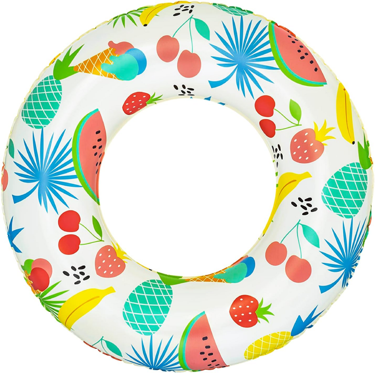 This fun and refreshing float features a bright fruit-themed print with bananas, pineapples, cherries, strawberries, and watermelons — perfect for summer days in the pool or at the beach.