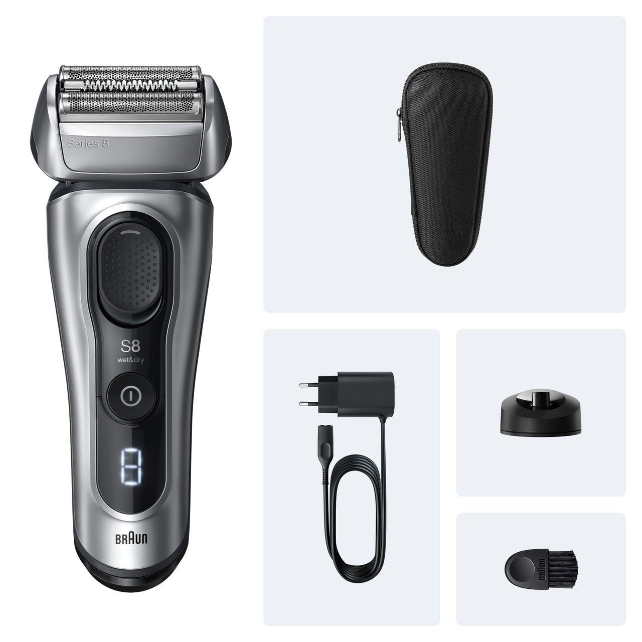 The Braun Series 8 8617s is a premium electric foil shaver designed for precision and comfort. Its ultra-flexible head, 4+1 synchronized cutting elements, and SensoAdapt™ technology adjust power 160x per second to match your beard’s density. It offers up to 60 minutes of cordless runtime, is 100% waterproof for wet and dry use, and includes a charging stand and travel pouch.