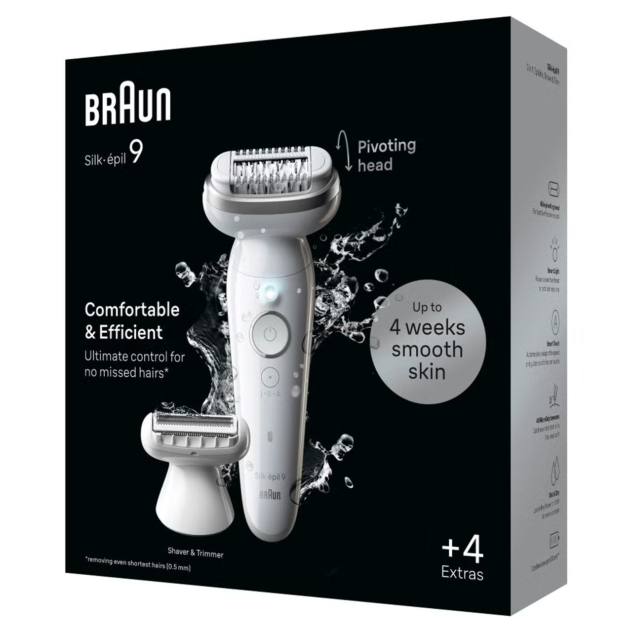 The Braun Silk-épil Series 9 Wet & Dry Epilator | SES9-041 is a premium device designed for efficient and long-lasting hair removal. It features a wide pivoting epilation head, 40 MicroGrip tweezers that remove hairs as short as 0.5 mm, and cordless wet & dry use for up to 50 minutes. The built-in SmartLight reveals fine hairs, and the ergonomic handle gives excellent control even in the shower.