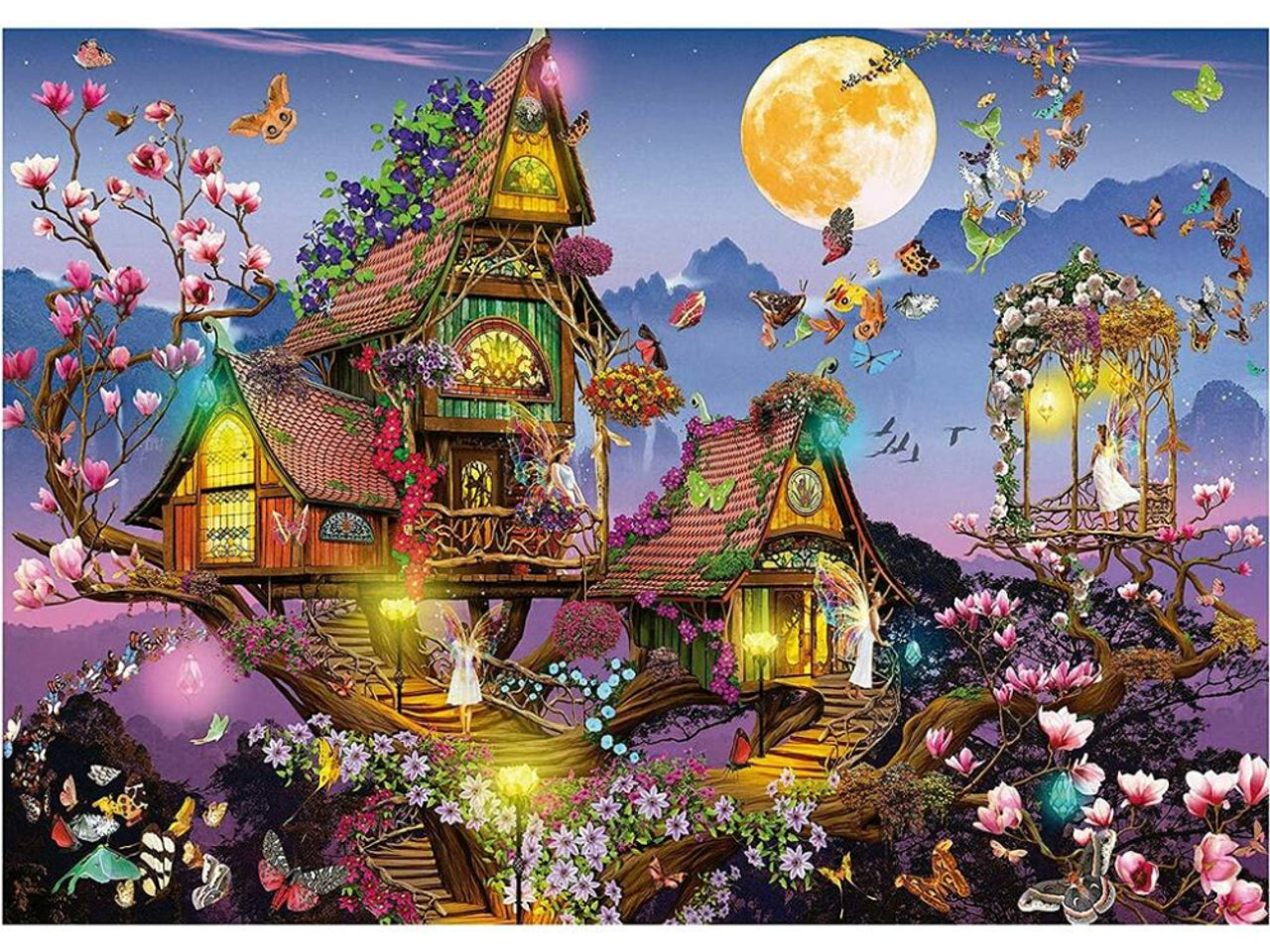 The artwork shows a glowing fairy house built into a giant tree, surrounded by butterflies, flowers, lanterns, and a bright full moon. Its vibrant colors and dreamy atmosphere make it a perfect puzzle for fantasy lovers and anyone who enjoys relaxing, artistic puzzles.