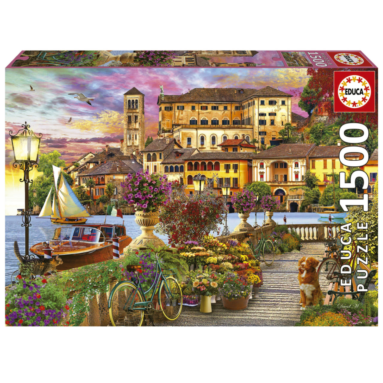 The Educa 19562 – Lakeside Italian Village is a beautiful 1500-piece jigsaw puzzle featuring a vibrant European coastal town filled with flowers, colorful buildings, boats, bicycles, and a serene waterfront.