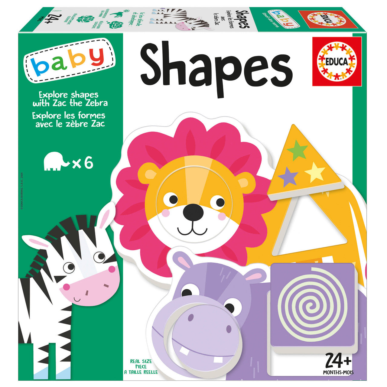 Featuring Zac the Zebra and his colorful friends, each puzzle piece is large, sturdy, and real-size—perfect for little hands learning to match, sort, and identify shapes. With bright illustrations and playful design, this set supports early cognitive and motor development in an enjoyable way.