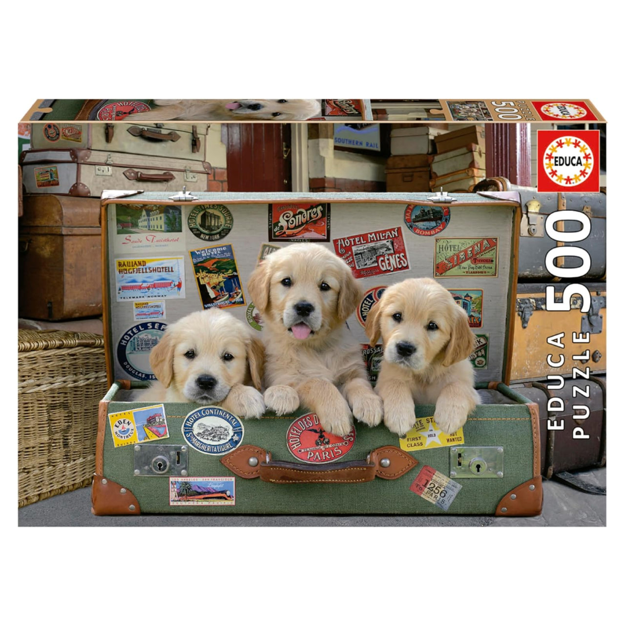 Assemble this adorable puzzle featuring three playful puppies sitting inside a vintage suitcase — a heartwarming scene for all ages.