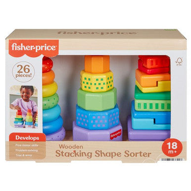 Encourage early learning with the Fisher-Price Stacking Shape Sorter. This wooden Montessori-style toy combines shape sorting and stacking to develop essential fine motor skills, hand-eye coordination, and early problem-solving. It features a sturdy sorting base and 25 easy-grip wooden shapes—including rings, octagons, and geometric blocks—to sort by shape and color, and stack for added engagement. Crafted from FSC-certified wood and packaged plastic-free to support eco-friendly play.