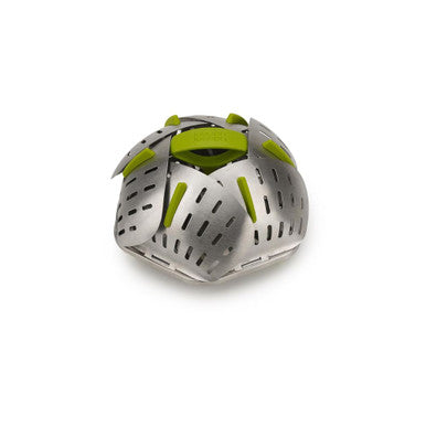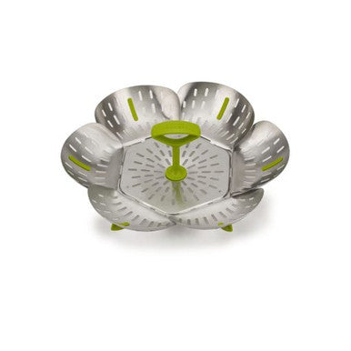 The Joseph Joseph Bloom™ Folding Steamer Basket is a versatile and space-saving tool for healthy cooking. Crafted from high-quality stainless steel, it features self-adjusting sides that expand to fit a variety of pots and pans. The heat-resistant silicone feet and handle allow safe use and easy lifting. When not in use, the basket folds flat for compact storage.