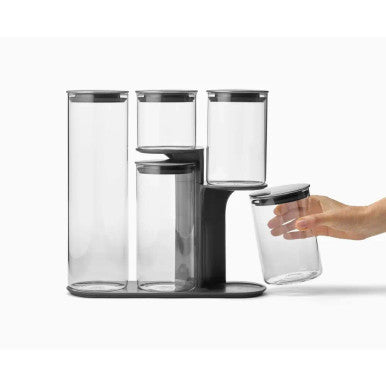 تتميز مجموعة حاويات التخزين الزجاجية الذكية هذه بحامل ذكي يتيح سهولة الوصول إلى أي برطمان، بغض النظر عن وضعه. الحاويات مصنوعة من الزجاج بأغطية محكمة الغلق من الفولاذ المقاوم للصدأ.