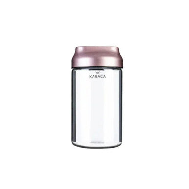 This container features a transparent glass body encased in a sleek rose gold-toned stainless steel exterior, combining durability with a modern aesthetic. The vacuum-sealing mechanism helps maintain the freshness of its contents by minimizing air exposure. Its ergonomic design ensures a comfortable grip, making it easy to handle and pour. The container's medium size allows for convenient storage, whether on the countertop or in a cabinet.