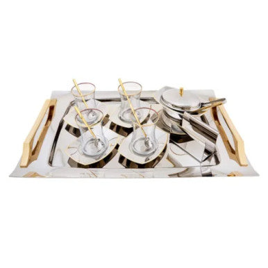 The Karaca Duru Gold 41-Piece Steel Tea Set is an elegant and comprehensive collection designed to enhance your tea-serving experience. This set includes 12 glass tea cups, each with a capacity of 132 milliliters, accompanied by matching tea plates and teaspoons. Additionally, it features a coordinating tray, a sugar bowl with lid, tongs, and a napkin holder. Crafted from high-quality stainless steel with gold accents, the set exudes sophistication and durability. The design seamlessly blends modern aesthetics with traditional elements, making it suitable for both everyday use and special occasions. To maintain the pristine condition and longevity of the set, hand washing is recommended.
