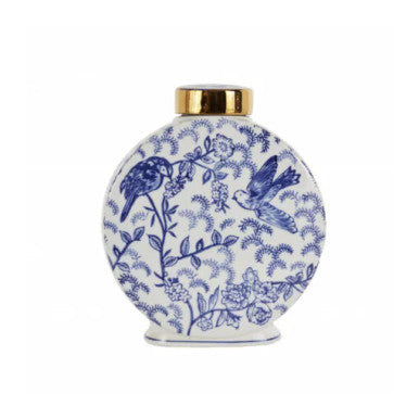 Design: Features a classic blue-and-white floral pattern with a glossy finish, complemented by a gold-tone lid.