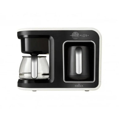 The Karaca Plus 2 in 1 Coffee Machine in Soft Cream is a compact and practical appliance designed for brewing both Turkish coffee and filter coffee in one device.