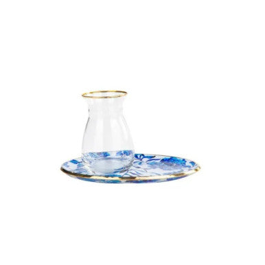 The Karaca Rosa Set of 6 Tea Cups in blue (SKU: 153.03.06.2033) is a beautifully crafted tea set designed to enhance your tea-drinking experience. This 12-piece set includes six glass tea cups and six matching saucers. Each saucer features an intricate blue floral motif with gold accents, adding a touch of elegance and sophistication to your table setting. The transparent glass cups complement the vibrant saucers, creating a harmonious and visually appealing ensemble. To preserve the delicate design and ensure longevity, hand washing is recommended.