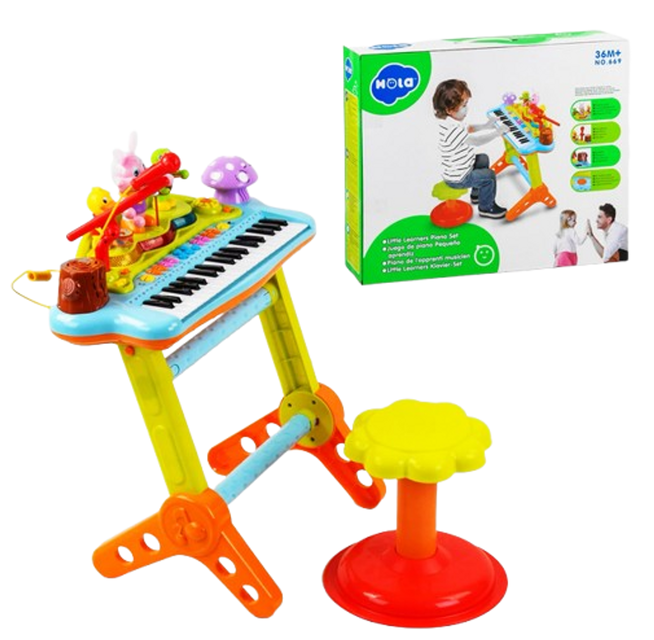 The Mola Little Learners Piano Set (MPN: 669) is a fun and educational musical toy designed for children 36 months and older. Featuring a colorful piano keyboard with multiple buttons, light effects, and playful sounds, it introduces kids to music in an engaging way. The set includes a child-sized stool for comfortable play and encourages creativity, rhythm, and hand-eye coordination. Perfect for early music education and imaginative play.