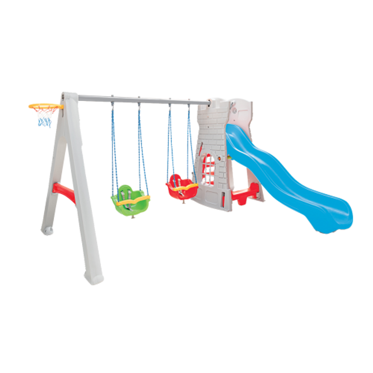 The Pilsan Castle Swing and Slide Set (07-957) is a complete play center designed to turn any backyard into a mini playground. With its castle-inspired design, this set includes a smooth, long slide, a sturdy swing, and an integrated basketball hoop — offering hours of active fun for children. Built from durable, non-toxic plastic, it ensures safety, stability, and lasting outdoor enjoyment.