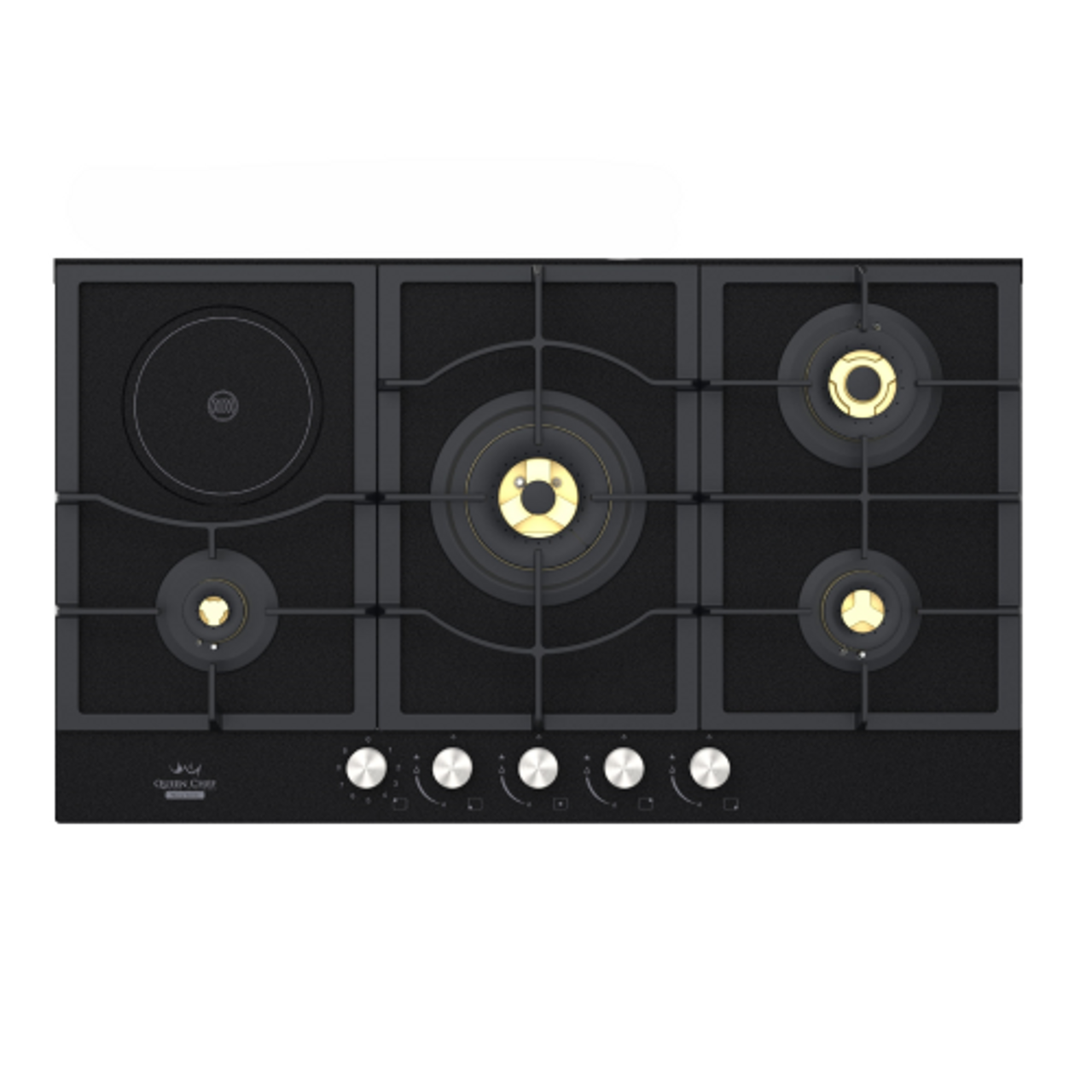 The Queen Chef Built-in Gas Hob 4 Burners & 1 Electric Burner - Matt Black | QCHB90-4G1EGBM (B) is a high-performance electric and gas cooktop designed for modern kitchens. It combines four gas burners with one ceramic electric hotplate, offering flexible cooking options and precise temperature control for everyday cooking needs.