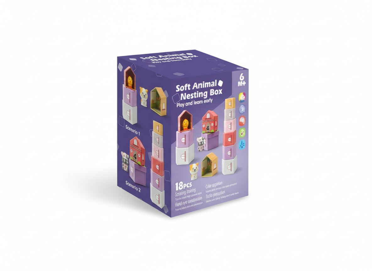 The Soft Animal Nesting Box | 1247 is a creative and educational toy designed to help babies and toddlers develop coordination, imagination, and fine motor skills. This 18-piece set includes colorful nesting boxes shaped like tiny houses and cute soft animal figures that fit perfectly inside. Each piece encourages stacking, sorting, and matching, making learning fun and interactive for little hands.