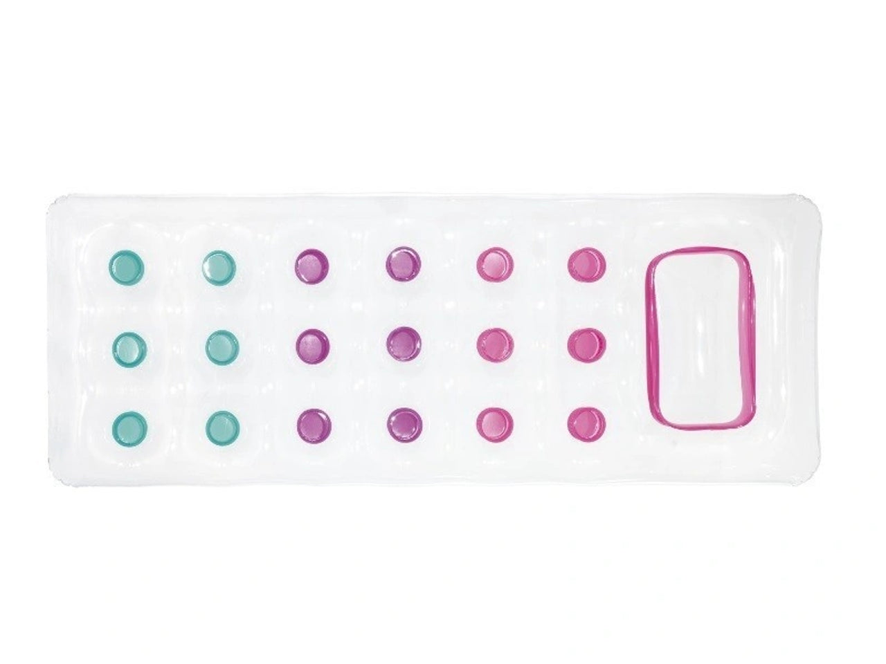 This premium inflatable lounger features a sleek transparent white design with colorful circular accents, providing both style and relaxation for your sunny pool days.