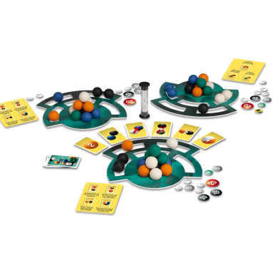 Dimension is a fast-paced, innovative puzzle game that takes place in three dimensions with 60 colourful spheres. All of the players play at the same time. Everybody tries to position the spheres on their trays to earn as many points as possible. The task cards indicate how the spheres must be placed to earn points: for example, exactly two orange spheres must be on the tray, black and blue must touch each other, and blue must not touch white. Complete these tasks while racing against the timer. You get a point for each sphere you use and a bonus token for using all five colours, but you lose two points for each task card you don’t follow correctly. Prove to your opponents that you are the master of multi-dimensional thinking!