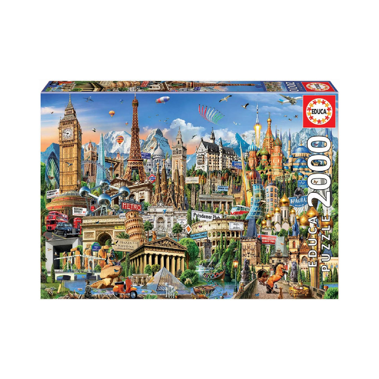 Travel across Europe as you assemble this detailed puzzle showcasing its most iconic landmarks — from the Eiffel Tower and Big Ben to the Colosseum and Sagrada Família.