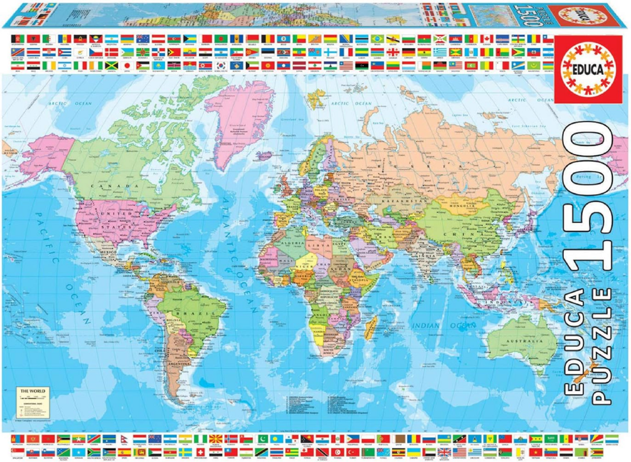 The Educa World Map 1500-Piece Puzzle (18500) is a detailed and colorful world map puzzle featuring countries, capitals, oceans, and geographic divisions. Perfect for geography lovers, students, travelers, and anyone who enjoys educational and informative puzzles. Along the edges, a complete set of world flags adds visual interest and helps with learning. With 1500 high-quality pieces, this puzzle offers a satisfying challenge and a beautiful result suitable for display.