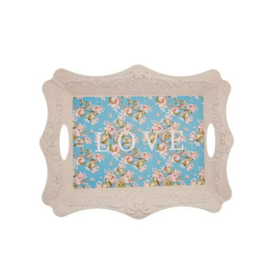 This rectangular tray, measuring 33 by 42 centimeters, features a clean white finish adorned with a subtle love-themed design, adding a touch of elegance and warmth to any setting. Its spacious surface is ideal for serving a variety of items, from beverages to appetizers, making it suitable for both everyday use and special occasions. Crafted from durable materials, the tray ensures longevity and ease of maintenance. The raised edges provide added security during transport, while its lightweight construction allows for effortless handling. This tray seamlessly combines functionality with a charming aesthetic, enhancing the presentation of your culinary creations.