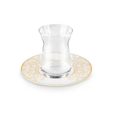 The Karaca Nazende Set of 6 Tea Cups (SKU: 153.09.01.6297) is an elegant collection designed for serving traditional Turkish tea. This 12-piece set includes six glass tea cups and six matching porcelain saucers. Each saucer features intricate patterns that add a touch of sophistication to your tea experience. The transparent glass cups allow you to appreciate the rich color of your tea, enhancing the visual appeal. The ergonomic design ensures a comfortable grip, while the saucers provide a stable base. To maintain the pristine condition and longevity of the set, hand washing is recommended.
