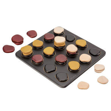 Each player obtains 8 pebbles in their color. The third color is neutral, and these pebbles are placed in the 4 corners of the board. On their turn, players add a pebble to the top of a stack of their choice before moving it. When moving a pile, players have to leave one pebble on each space crossed. The first player lining up 4 pebbles of their color from top view wins the game